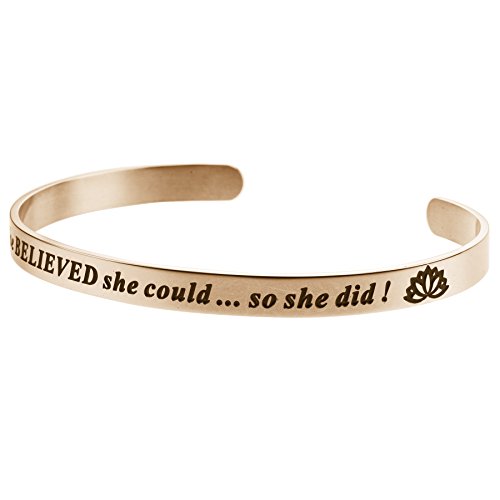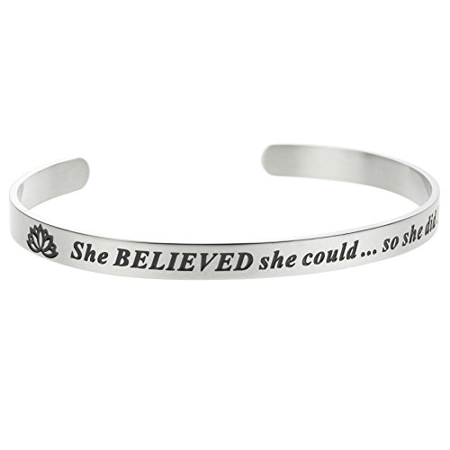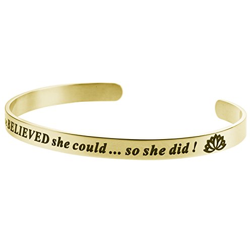 -. Binding : Jewelry -. Brand : Qina C -. Color : Gold Tone -. Department : womens -. Feature : Engraving: She believed she could so she did / 316L stainless steel (Stamped) with Gold-tone (I.P.G.) / Size: approximately 65mm in diameter x 6mm wide; with approximately 1.4mm thick -. Label : Queenberry -. Manufacturer : Queenberry -. Model : F098 -. MPN : F098 -. PartNumber : F098 -. ProductGroup : Jewelry -. ProductTypeName : FASHIONNECKLACEBRACELETANKLET -. Publisher : Queenberry -. Studio : Queenberry -. Title : Qina C. She Believed She Could So She Did Adjustable Cuff Bracelet Wristband Bangle