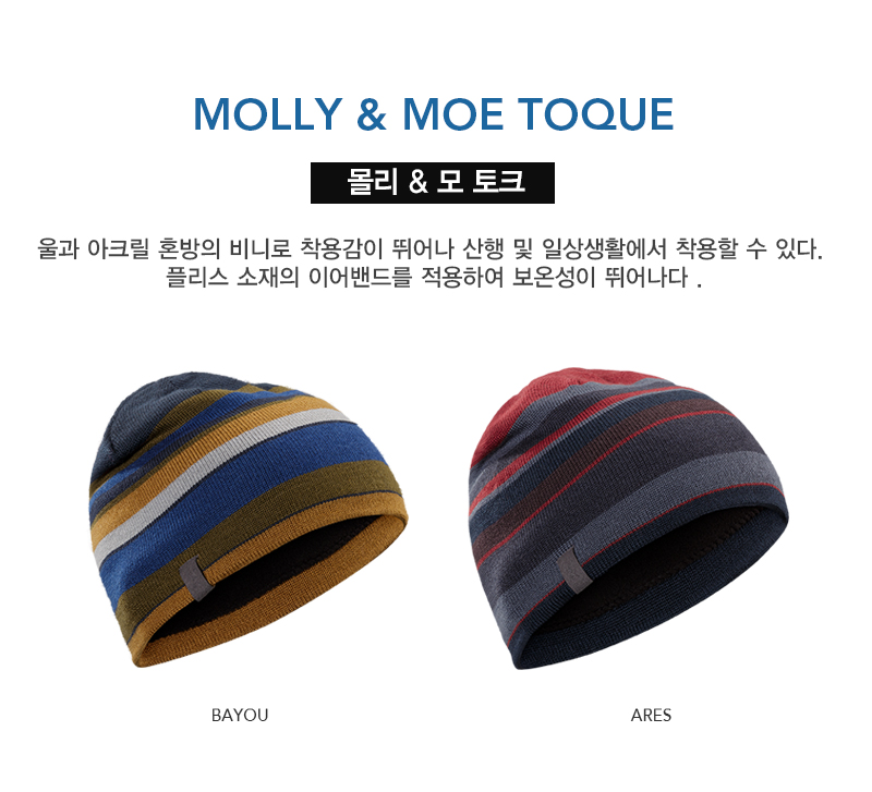 울과 아크릴 혼방의 비니로 착용감이 뛰어나 산행 및 일상생활에서 착용할 수 있다. 플리스 소재의 이어밴드를 적용하여 보온성이 뛰어나다 .