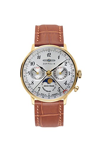 -. Title : Zeppelin Series LZ129 Hindenburg Multifunction Unisex Day/Date Moon Phase Analog Watch Goldtone and Brown 7039-1
