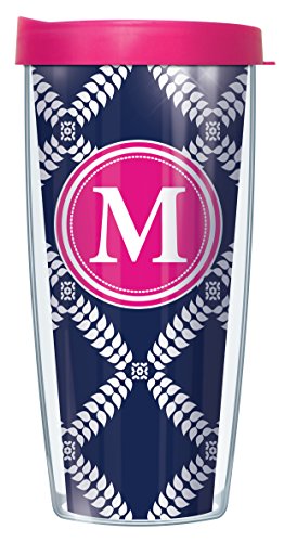 Navy Royal Diamonds Letter "M" Initial On Pink 22 Oz Traveler Tumbler Mug with Lid