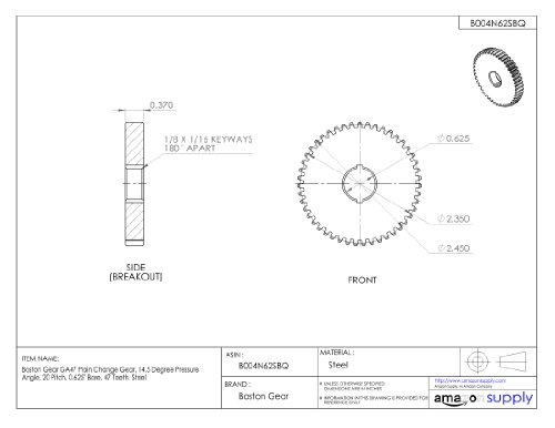 Boston Gear GA47 Plain Change Gear, 14.5 Degree Pressure Angle, 20 Pitch, 0.625" Bore, 47 Teeth, Steel