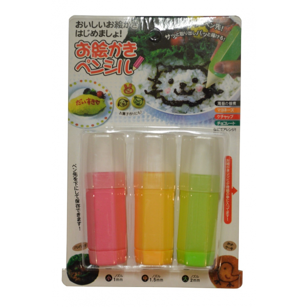 Kreasikanlah makanan anak anda dengan gambar2 lucu. Food Drawing Pen dengan bahan pewarna makanan bisa digunakan untuk menggambar atau menulis di cookies, nasi bento, roti dan makanan lainnya.