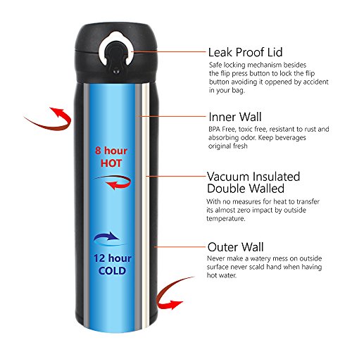 It provides safety usage with Free BPA plastic cover and 18/8 stainless steel body.Impact-resistant. It presents easy usage in journey or daily activities through solid lock system and seal cap.
