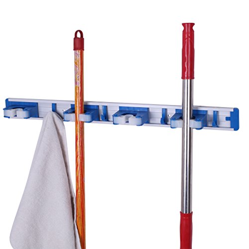 - Space Saving Mop Broom Holder: Clean design and compact.Broom Holder is the most ideal wall-mounted holder that's ever been invented, perfect to save space in garage, gardening shed, pantry, and more! Don't be fooled by the knock-offs. Package include: 1 x Mop and Broom Holder(With a bag of screws and expansion sets)