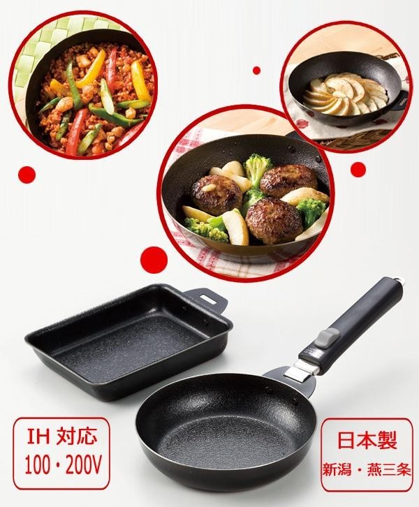 ■商品サイズ/重量■ フライパン(18cm):約205×180×42mm / 約390g 角型フライパン(13×18cm):約216×134×35mm / 約510g 着脱式ハンドル:全長188mm / 約145g