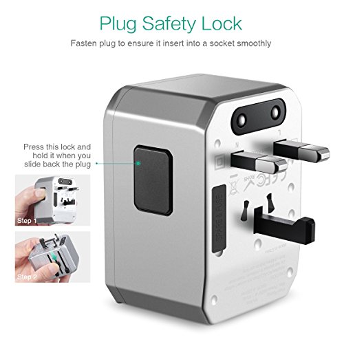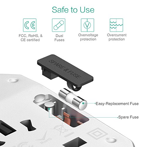 4. SAFETY PROTECTION: Built-in smart IC, plug lock and safety shutters to protect you and your devices from over-voltage and over-current during charging. It's FCC, CE, and RoHS certified with dual 8A fuse in small compartment beside the plug, one of them is for back-up replacement.