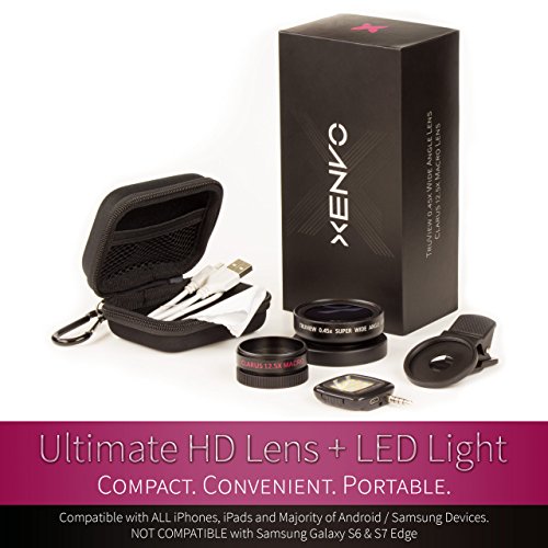-. Feature : ✔ TRU-VIEW WIDE ANGLE LENS - Capture stunning and sweeping views of your everyday moments. The TRU-VIEW 0.45x Professional-Grade Lens gives you the power to capture 45% MORE PICTURE than your phone's built in lens WITHOUT sacrificing quality. Fantastic for photographing people, pets, landscapes, cityscapes, building interiors & exteriors, and any situation you can imagine where you need "More Picture" and bang for your buck. Plus, NO DARK CORNERS or vignetting like cheaper lenses. / ✔ CLARUS MACRO LENS - Marvel your senses with the 12.5x Super-Macro Lens attachment. Capture super close-ups that you simply can't get with your phone's built in lens. See all the intricacies and details of your favorite photo subjects with precision focus for sharp and clear pictures every time. / ✔ RECHARGEABLE LED FILL LIGHT - The included LED light plugs right into your phone's earphone jack and includes 3 settings: Low, Medium, and High. Instantly brighten your surroundings with warm continuous light. The warm and natural LED light is superior to your smartphone's built in flash - which often blinds people and yields unnatural color in your photos - especially in darker settings and venues. Say goodbye to frustrating photo "retakes" and hello to brilliant photos the first time. / ✔ TRU-GRIP LENS CLIP - The ENVO "TRU-GRIP" Lens Clip offers superior gripping power to STAY PUT on your phone. Just center the clip over your cell phone lens and you're ready to go at a moment's notice. The gripping surfaces of the clip are made of soft, yet firm and resilient rubber. Your iPhone and Android devices are safe from harm. No need to worry about wear and tear or losing your lens when you're in action mode, framing your next perfect shot. / ✔ PERSONAL & PROFESSIONAL PHOTOS & VIDEOS - Shooting "selfies" and large group photos is a snap. A huge hit at social gatherings and family outings. Also designed for today's most demanding content creators, bloggers, marketers, social media and video pros, who count on their smartphone camera to grow their online presence and business.