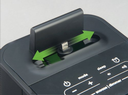 - Feature : Play and charge your Android Smartphone; FM Alarm Clock Radio allows you to wake & sleep to radio or tone / Works with iHome Sleep alarm app for enhanced wake & sleep options (free Android Market download) / SmartSlide dock with custom Quick Charge micro USB cable; AUX line-in for music playback with included stereo audio cable connection to your smartphone or other music device / Specially designed stereo Reson8 speaker chambers for superior audio performance; built-in EXB sound enhancement / Battery backup ensures your alarm sounds during a power failure