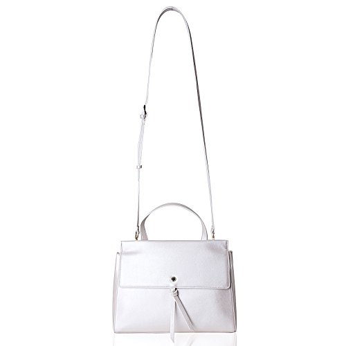 Medium shoulder bag. Flap with tassel drop on flap. Magnetic closure. Single handle. Dethable strap with pin buckle and dog clip ends. Logo stud. Inside zipped pocket.