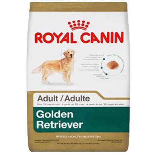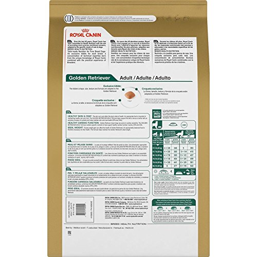 Royal Canin Golden Retriever Dog Food features an exclusive kibble tailor made for each breed. The kibble's shape, size, texture, and formula are adapted to the Golden Retriever. The skin and coat reflect the dog's state of health. An appropriate food is important in maintaining healthy skin and coat. The Golden Retriever Adult formula helps support the skin's role as a barrier with an exclusive complex of nutrients and helps maintain skin and coat health (EPA and DHA). Golden Retriever breed dogs are prone to cardiac sensitivity. The Golden Retriever Adult formula contains specific nutrients to help support healthy cardiac function: Taurine, EPA, and DHA. Excess weight gain can affect the health of Golden Retrievers. An appropriately balanced food is therefore necessary for their health. This formula helps maintain the Golden Retriever's ideal weight. 100% complete and balanced nutrition. Designed exclusively for pure breed Golden Retrievers over 15 months old. Size: 30 pounds.Feature