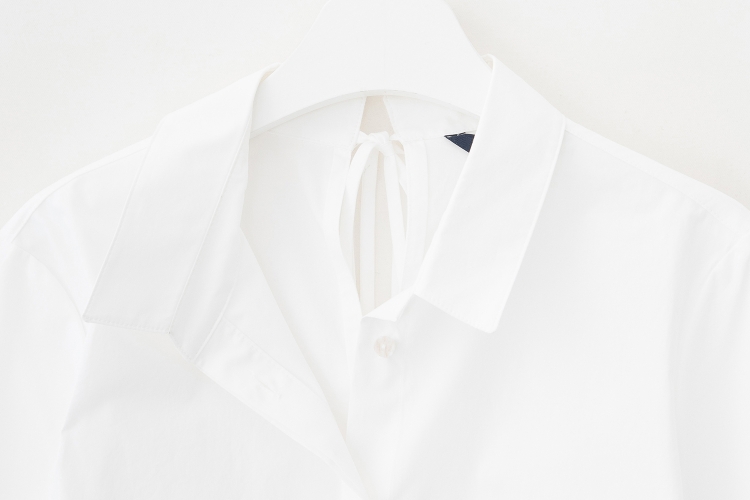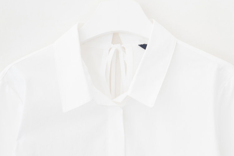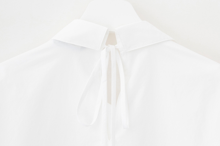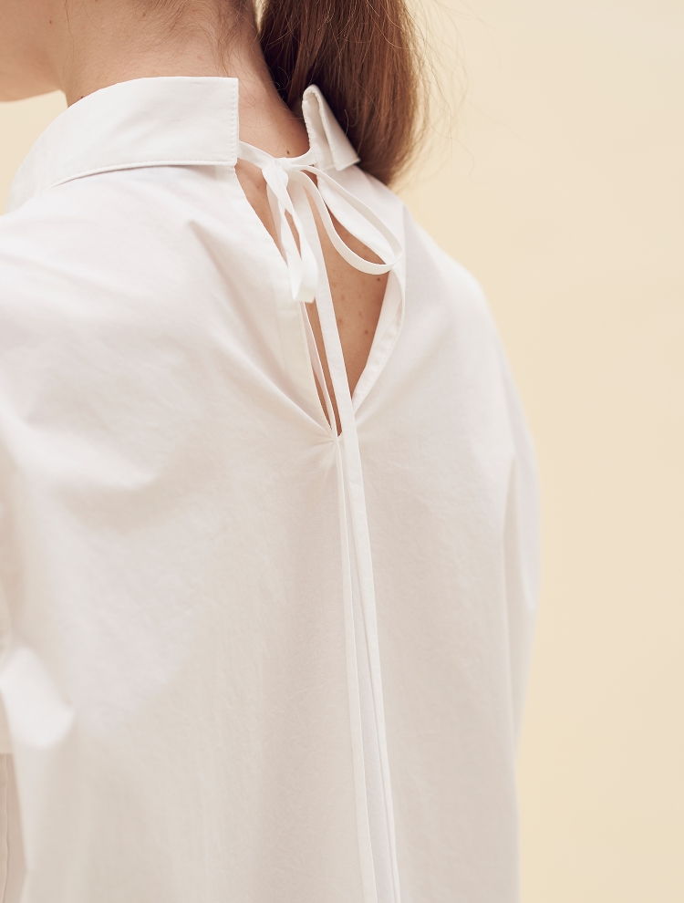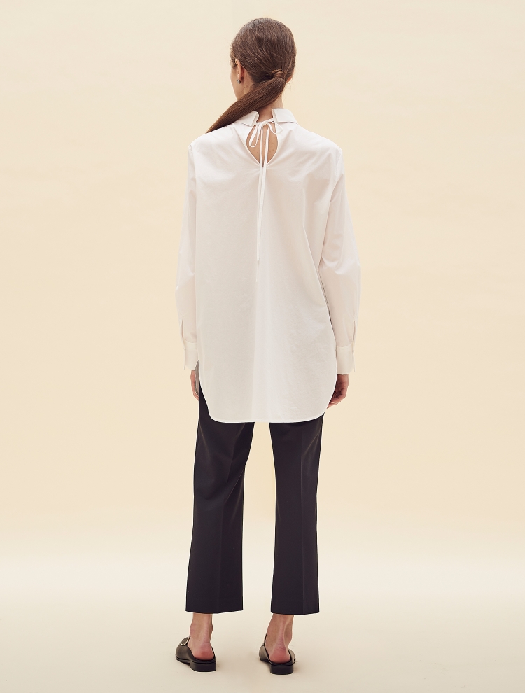 - 넥라인 후면의 리본 묶음 디테일의 롱셔츠입니다.