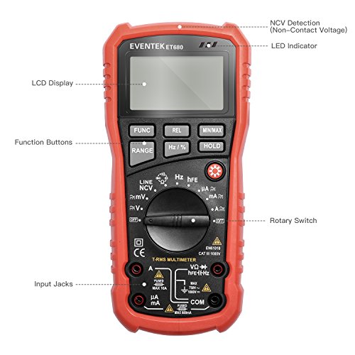 - WHAT YOU GET: 1x Eventek ET680 Digital Multimeter, 1x Operator's Manual, 2x Test Lead, 1x Built-in Battery(9 V),24-Month Warranty, Risk Free Return within 30 Days