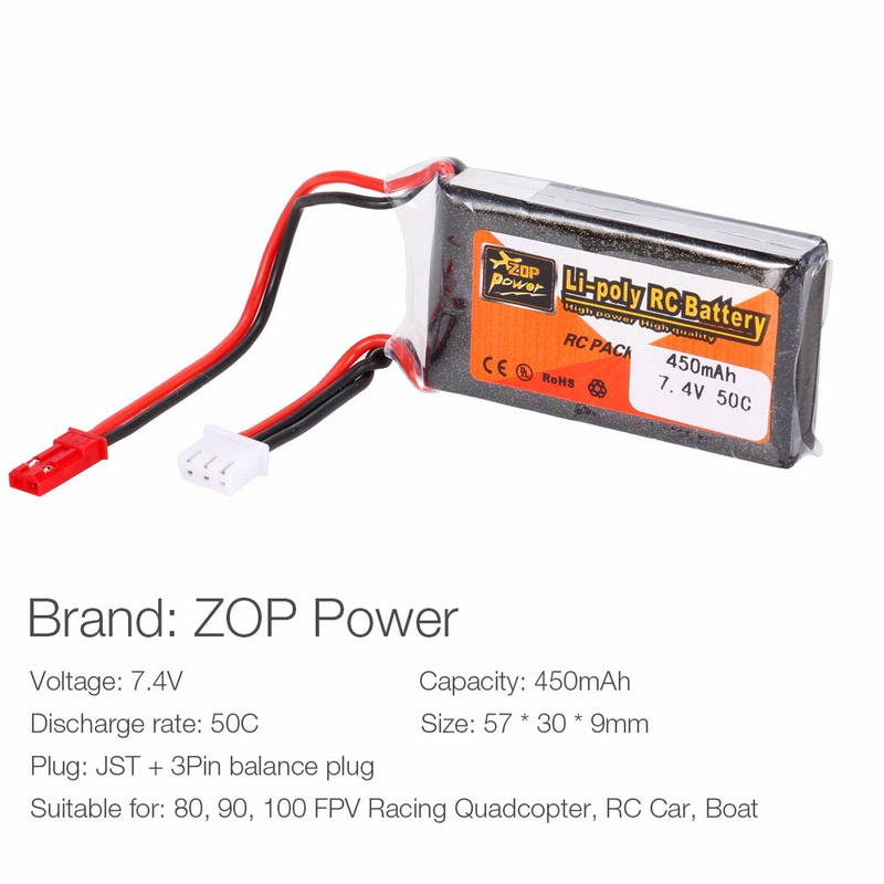ZOP Power 2S 7.4V 450mAh 50C li-po battery with JST plug for RC fans. This battery is suitable for 80, 90, 100 RC FPV racing drone and other RC car and boat with JST plug. Perfect choice for you to enjoy more flying fun.
