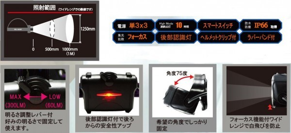 | 仕様 | 電源:単3電池×3本 明るさ調整レバー付 フォーカスコントロール 調光機能 後部認識灯付 防塵・防水LEDヘッドライト 角度調整75度 |