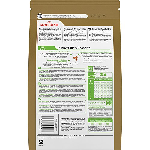 -. Binding : Misc. -. Brand : Royal Canin -. EAN : 0030111510655 -. Feature : Helps maintain a Pug's wrinkled skin and coat with an exclusive complex of nutrients; Enriched with EPA and DHA / Helps support digestive health and helps to maintain a balanced intestinal flora / For Pug puppies from 8 weeks to 10 months -. Label : Animal Supply Company (RC) -. Manufacturer : Animal Supply Company (RC) -. Model : RC510625 -. MPN : ROY-361 -. PackageQuantity : 1 -. PartNumber : ROY-361 -. ProductGroup : Pet Products -. ProductTypeName : PET_SUPPLIES -. Publisher : Animal Supply Company (RC) -. Size : 2.5 pounds -. Studio : Animal Supply Company (RC) -. Title : Royal Canin Breed Health Nutrition Pug Puppy dry dog food, 2.5-Pound -. UPC : 030111510655