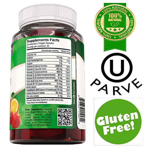 - Title : Daily Multivitamin - Kosher Gummies for Adults - Contains Essential Vitamins and Minerals - Supports Overall Health - Vitamins A, C, D, E, B-6, B-12- Folic Acid, Biotin, Pantothenic Acid, Iodine, Zinc- Orange, Cherry and Strawberry Flavored- 60 Gummies - Gluten Free - No Artificial Colors - Pareve & Halal Certified