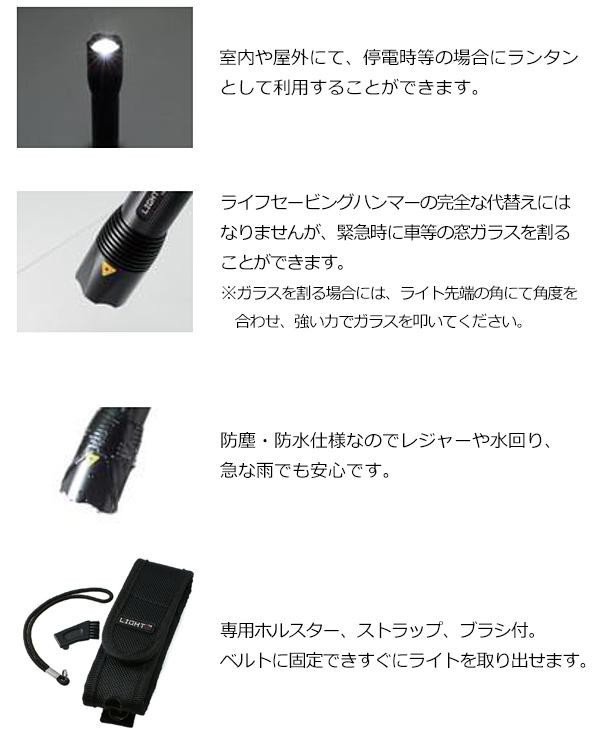 明るく高性能なLEDチップと配光特性に優れたレンズを採用しています。フォーカスコントロールと6つの点灯モードを搭載しており、レジャー、キャンプといったアウトドアにはもちろん、防災用や暗所など様々なシーンで活躍します。ライフセービングハンマーの完全な代替えにはなりませんが、緊急時にはガラスを割ることもできます!! |