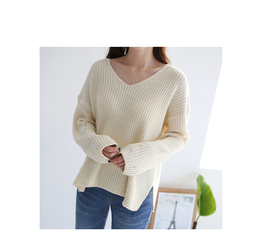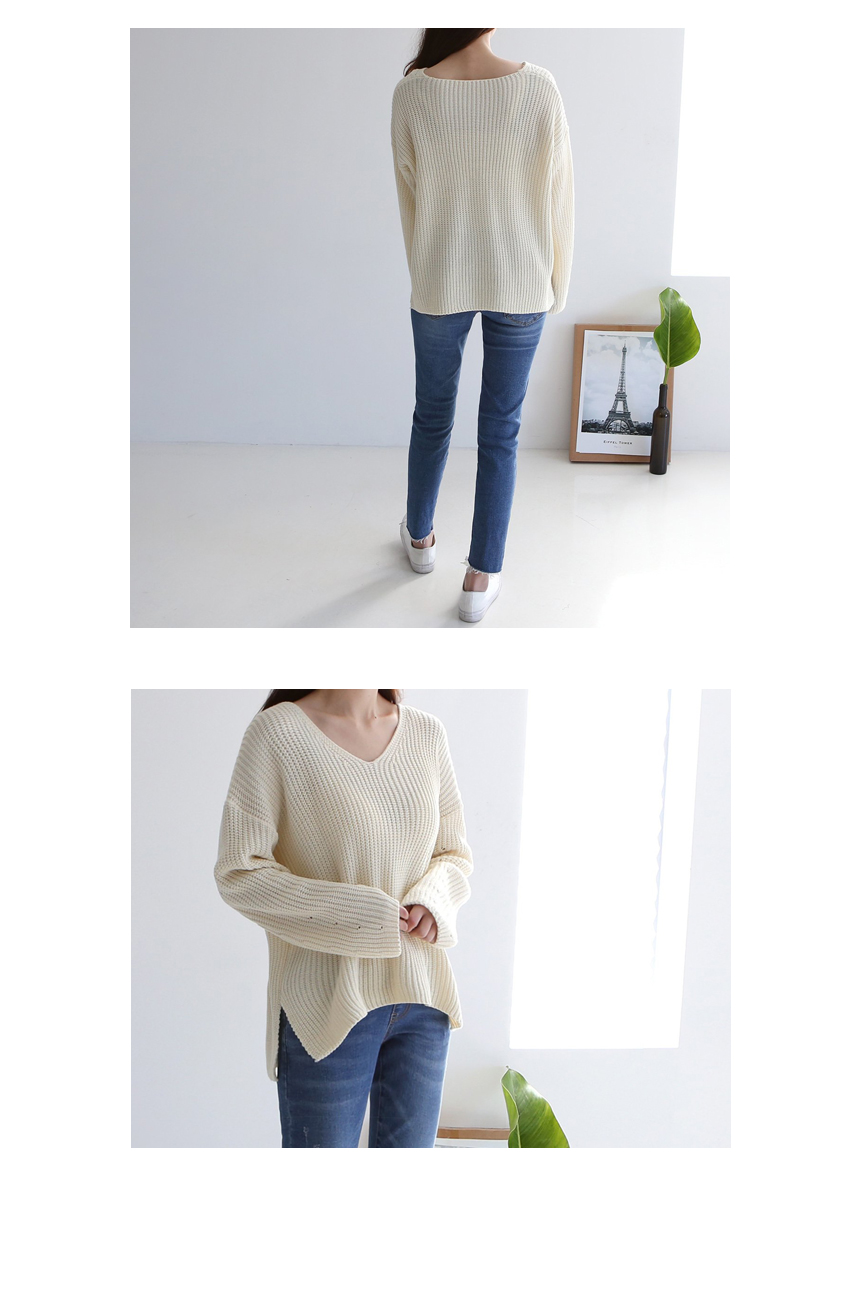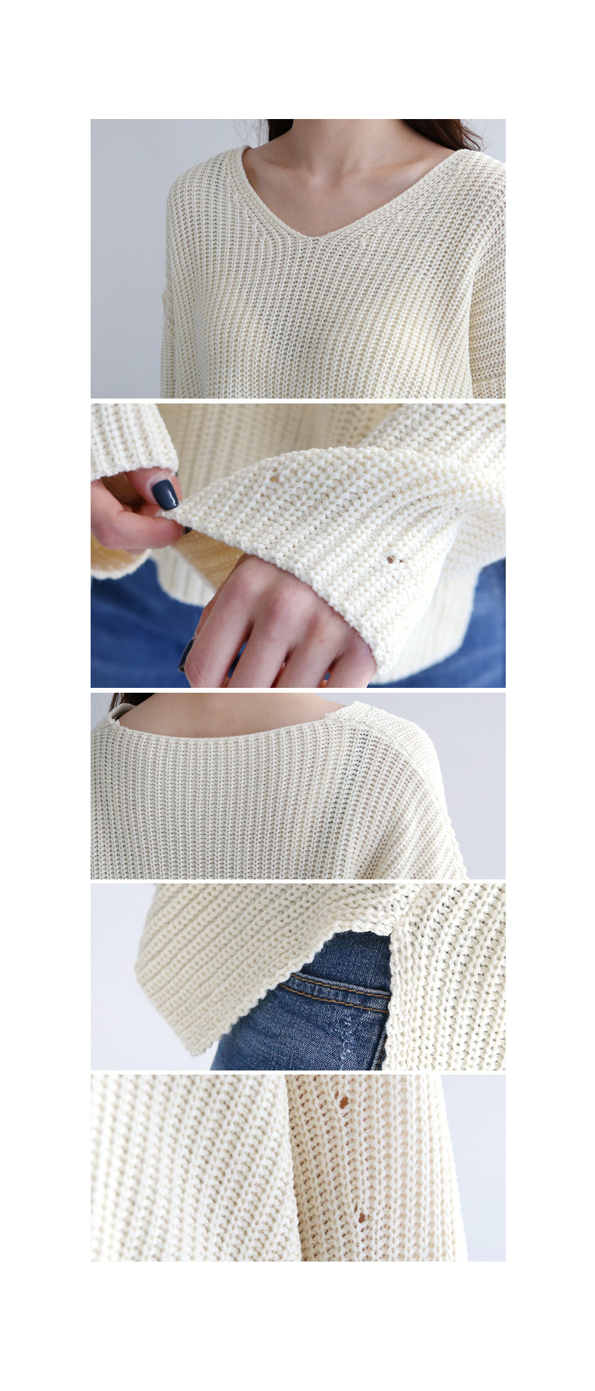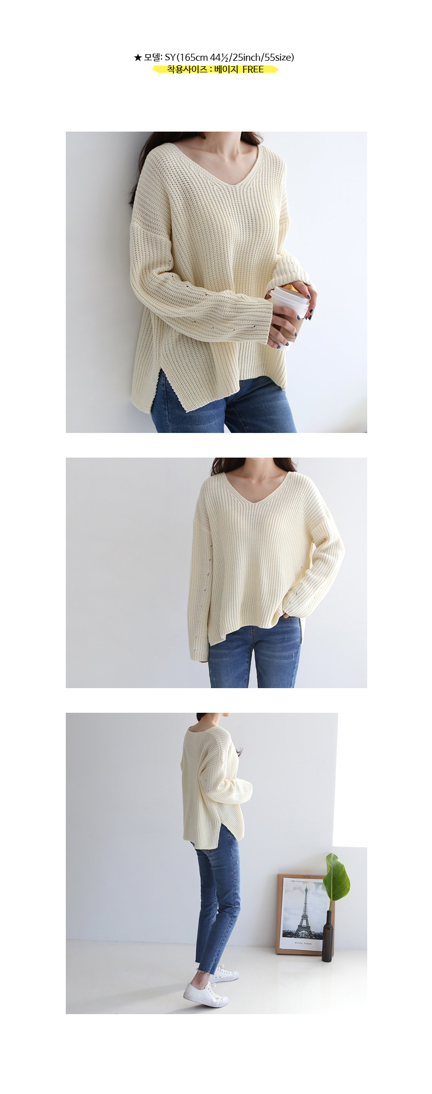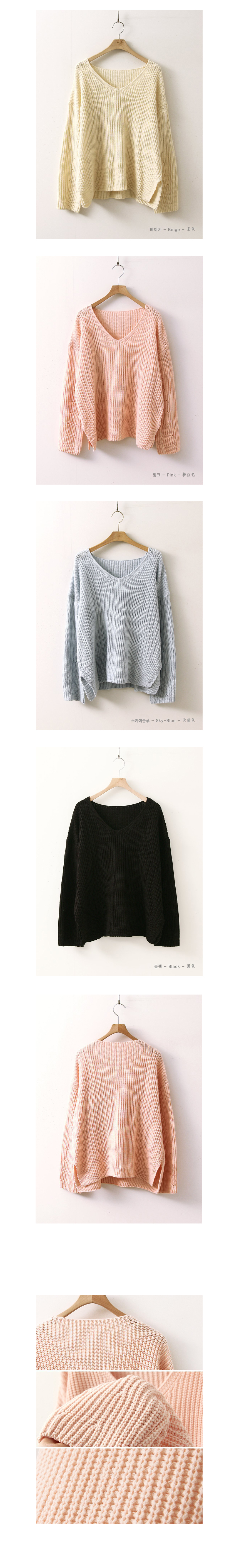 중간 굵기의 아크릴 원사로 자연스러운 짜임이 보이는 깔끔한 브이넥 니트예요 시원한 목선이 여성스럽게 돋보이는 아이템으로 편하게 걸치기 좋은 핏과 산뜻한 봄 컬러감이 눈에 띄는 아이템이랍니다 여유 있게 넘어가는 어깨선과 연결된 소매통은 중간중간 짜임으로 포인트를 준 디테일이 멋스러워요 색상은 베이지, 핑크, 스카이블루, 블랙 사이즈는 FREE44~66반