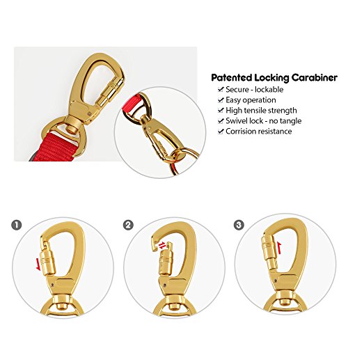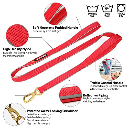 Features · High density nylon fabric with high-grade neoprene padding · Double soft padded handles, one for traffic control · Reflective piping on the edges of the leash · Patented plated metal locking carabiner · Plated metal D-ring for accessories · Machine wash · Tumble dry · Lifetime warranty