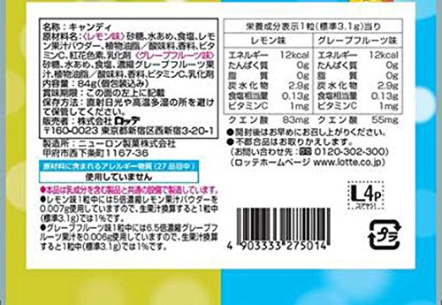 原材料:<レモン味>砂糖、水あめ、食塩、レモン果汁パウダー、植物油脂/酸味料、香料、ビタミンC、紅花色素、乳化剤<グレープフルーツ味>砂糖、水あめ、食塩、濃縮グレープフルーツ果汁、植物油脂/酸味料、香料、ビタミンC、乳化剤