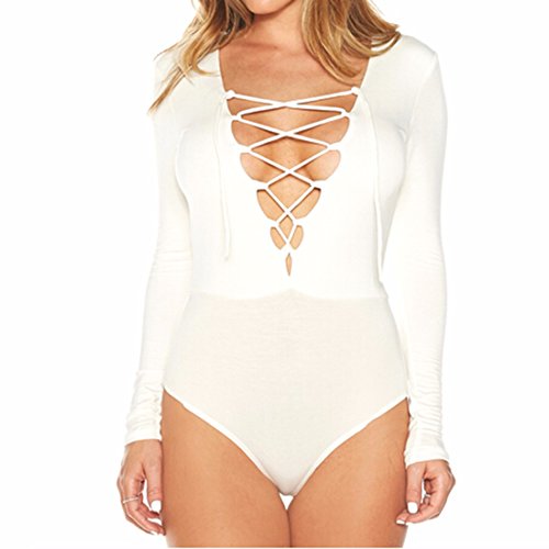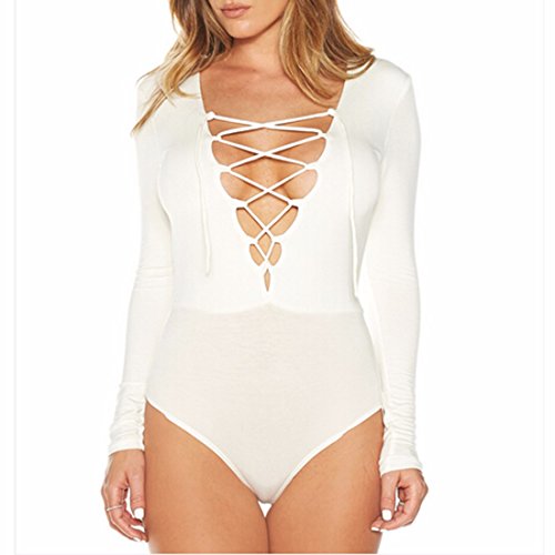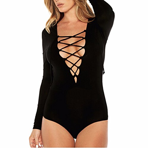 Sexy Womens Long Sleeve Tops Deep V Lace-Up Bodycon Jumpsuits Bodysuits S M L