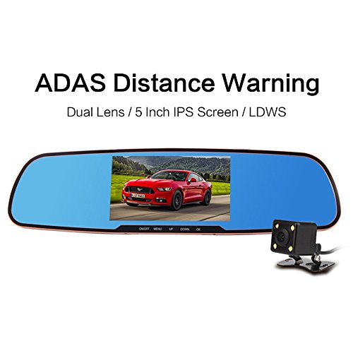 -. Title : Dash Cam Car DVR Camera Dual Lens With ADAS Distance Warning, Full HD 1080P Car Front Camera + Rearview Camera, 5 Inch LCD screen 170 View Angle,Superior Night Vision,Free 16G Card