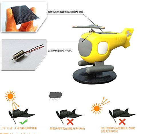 How to play: This cute mini model works in sun power. Place the model in directly sunlight, and give the propeller a gently push, it will active and start to charming you. Please be attention, it can't run in cloudy or rainy day . No power storage function, and no work in night. The running last-time of every launch will be different, even that it may stop automatically according to sun power decrease or sun position angle change. It's not product damage or defective, it's related to sun.