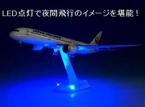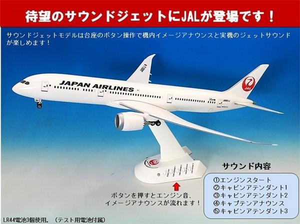 JAL・B787-9サウンドジェットモデルの1/200スケールエアプレーンモデルです。台座のボタンを押すと実機のエンジン音、キャプテン、キャビンアテンダントのイメージアナウンスが流れます。台座にあるLEDを点灯させることで夜間飛行の雰囲気が味わえます。 |