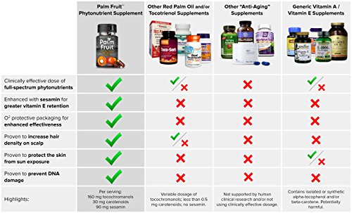 Palm Fruit is the most scientifically researched anti-aging supplement on the market. The plant based nutrients protect the skin from UV exposure by minimizing damage from UVA and UVB rays, which allows the skin to stay in the sun longer without sunburn or photoaging. Palm Fruit increases the skin's tolerance to sunlight by up to 250% after 12 weeks of supplementation. The carotenoids, tocochromanols, and sesamin work by dissipating the UV light energy away from DNA, lipids, and collagen. For those with sensitive skin, topical sunscreen is recommended for additional UV protection. Research suggests that Palm Fruit can produce a significant reduction in the appearance of wrinkles in healthy adults after 4 weeks of supplementation. The tocotrienols and carotenoids improve skin elasticity and complexion by restoring cellular hydration, stimulating type-1 collagen synthesis, and reducing DNA damage. These fat soluble micronutrients readily absorb into the skin through dietary intake, including the stratum corneum, dermis, and epidermis. Palm Fruit increases the number of hairs on the scalp by an average of 38% after 8 months in men and women suffering from hair loss. The tocotrienols and carotenoids trigger hair growth and produce a fuller head of hair by stimulating IGF-1, vascular endothelial growth factor (VEGF), and keratinocyte growth factor (KGF) in aging hair follicles. Palm Fruit can be used safely with minoxidil (Rogaine) and/or finasteride (Propecia) to reverse hair loss and/or prevent further thinning of the hair. Palm Fruit is a broad-spectrum extract that delivers over 8 naturally occurring forms of vitamin E, and over 12 different carotenoids. Unlike other vitamin E supplements, Palm Fruit includes 90 mg of the lignan sesamin which ensures maximum retention of vitamin E, while avoiding side-effects of excess vitamin E supplementation such as vitamin K depletion. Patented: US Patent 7211274 US Patent 7544822Feature