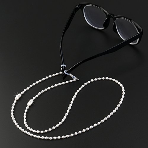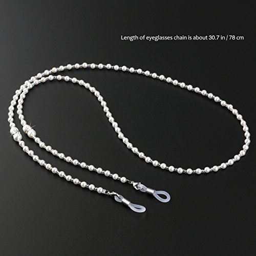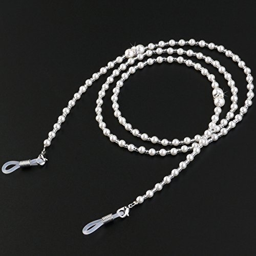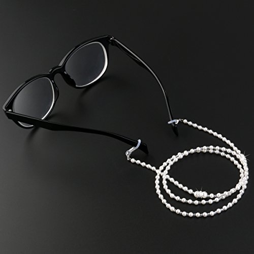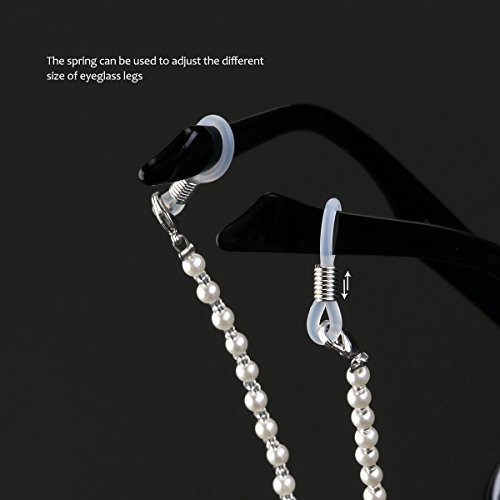 -. Feature : Color: White.Material: Synthetic pearl, metal. / Total length: about 70cm /28-inch. Peal diameter: about 2mm/ 4mm /6mm. / Delicate snake chain style eyeglass chain, simple and fashion. / Adjustable silver rubber ends with metal coils. / It is a great jewelry, both sides of the high elastic silicone rubber tip firmly entangle the temple, not easy to fall off.