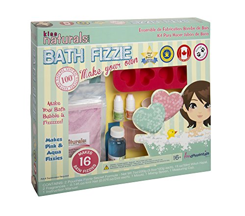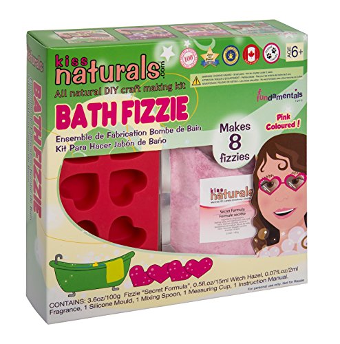 BATH FIZZIE: Let the fun bubble to the surface with our natural Bath Fizzie kit! 100% SATISFACTION GUARANTEED Kiss Naturals has a 100% satisfaction and money back guarantee on all our products. INCLUDED IN THIS DIY KIT (Makes 16 Bath Fizzies): • 2 Packs of "Secret Formula" Powder (1 pink, 1 blue) • 2 Bottles of Essential Oils (Witch Hazel and Safflower) • 1 Silicone Mold • 2 Bottles of Natural Fragrances (Jasmin and Tropical Sunset) • 1 Measuring Cup • 1 Spatula • Easy to Follow, Step-by-Step Instructions Included NORTH AMERICAN INGREDIENTS & CANADIAN MADE All of our ingredients are sourced from North America and all our products are made in Canada. WE NEVER USE ANY NASTY INGREDIENTS OR CHEMICALS LIKE: • Parabens • Sulfates • Synthetic Fragrances • Synthetic Dyes • Petrochemicals Just PURE and NATURAL ingredients! You want the best for your children, and so do we, that's why we make all our products safe enough to eat. THE KISS NATURALS STORY We started our company when our youngest daughters started taking an interest in cosmetics and skincare. When we looked for fun and healthy products for our kids to use we noticed a lot of nasty chemicals and ingredients in the majority of them. Our company produces fun, one-of-a-kind, DIY craft kits using only high quality natural ingredients. These kits make everyday products you can enjoy at an affordable price. Products like lip balms, bath fizzies (bath bombs) and glycerine soaps. No need to shop around in stores or online to source ingredients. Everything you need is included in each kit, with simple to follow instructions. At Kiss Naturals, we believe that nature got it right the first time. We don't add fillers, additives, dyes or synthetics to any of our products. We simply use nature's ingredients in their purest form.Feature