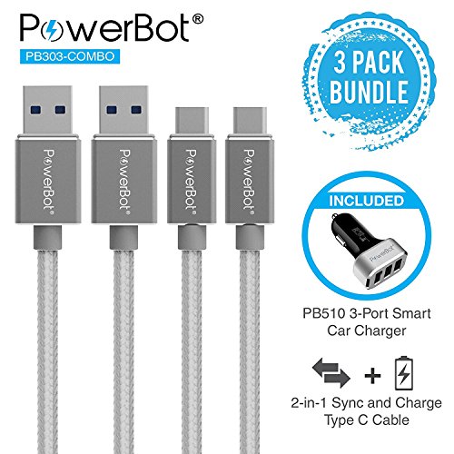 -. Title : PowerBot PB303 3-Pack Type C Charging Syncing Data Transfer 2.4A Cable & Car Kit Bundle w/ 4FT 5Gbps High-Speed USB 3.1 Type-C to USB 3.0 Type-A Braided Nylon Cable & 5.1A 25.5W 3-Port Smart Charger