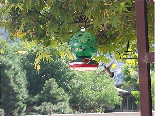 -. Feature : New Hand Blown Glass Hummingbird Feeders / Huge Reservoir Storage That Holds Up To 24 Fluid Ounces Of Nectar / 4 Ports for Hummingbird to Rest and Drink / Green Globe Color With Faux Flowers Embeded Will Bring Attention to Hummingbirds / S Hook Comes With Feeder For Use with Tall Plant Hanger or Hang from Tree
