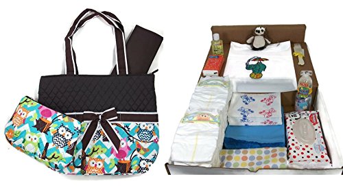 -. Title : Sunshine Gift Baskets - Owl Diaper Bag with Accessory Bag, Changing Pad and 101 Piece Starter Set