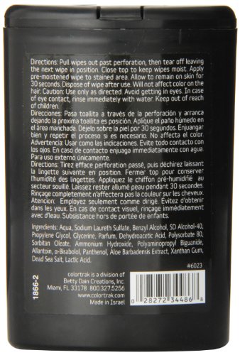 Say goodbye to unwanted hair color stains with colortrak wipe-off hair color remover wipes. Each canister contains 50 pre-moistened towelettes that easily remove hair color stains from skin using a non-irritating aloe formula.Feature