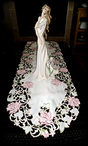 -. Binding : Kitchen -. Brand : Galleria di Giovanni -. Color : multicolor with Cream -. EAN : 0782398838884 -. Feature : This Fancy Pink Rose runner has creamy ivory fabric with swirling delicate roses and touches of tender green leaves. A lovely floral that is both elegant and feminine. Makes a wonderful gift! / Cream color fabric ~ Approx 70" x 15" ~ 100% polyester / Have fun coordinating with many matching pieces! / Check our storefront Galleria di Giovanni to find different sizes. -. IsAutographed : 0 -. Label : Galleria di Giovanni -. Manufacturer : Galleria di Giovanni -. PackageQuantity : 1 -. ProductGroup : Home -. ProductTypeName : HOME -. Publisher : Galleria di Giovanni -. Size : Approx 54" x 15" -. Studio : Galleria di Giovanni -. Title : Fancy Pink Rose 70" Table Runner Dresser Scarf Cream Doily Victorian -. UPC : 782398838884