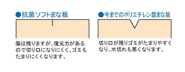 | 大きな切り口が残りにくい弾力性のある素材を使用しています。切り口にゴミがたまりにくく、水切れも悪くなりません。抗菌剤入りで、衛生的に使えます。側面には持ち上げやすいよう、切り込みがついています。 |