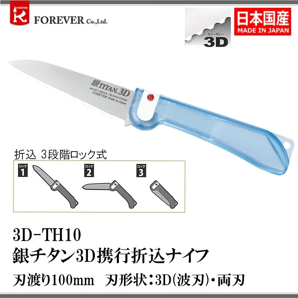 | 仕様 | 刃渡り:100mm 刃形状:3D(波刃)・両刃 3段階ロック式 折込収納可 食洗機使用不可 チタン合金複組成刃物 特許第3593414号 |