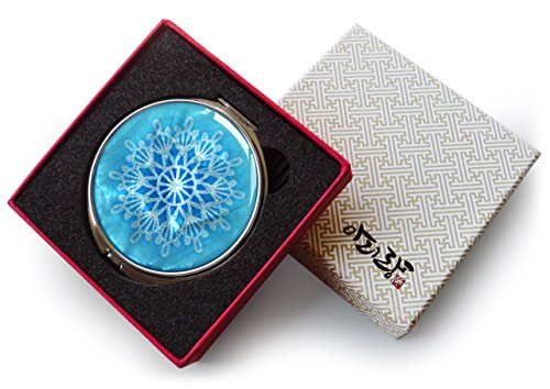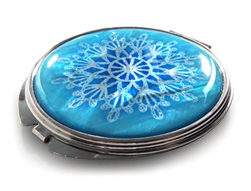 Sky Blue Folding Makeup Mirror Mother of Pearl Metal Dual Compact Magnify Snowflake White Lace
