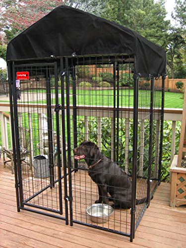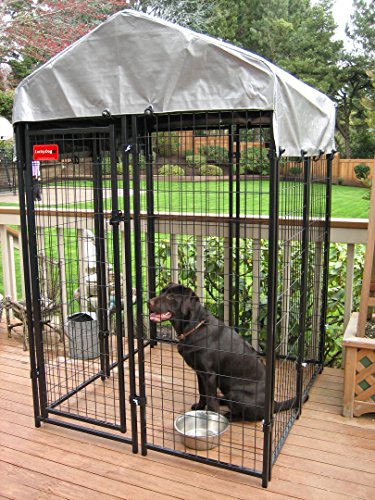 -. Feature : Dimensions: 8L x 4W x 6H feet / 10-gauge welded wire with black powder coat / Easy to assemble with no tools required / Includes single door, cover, and lockable latch / Ideal for decks, patios, or yards