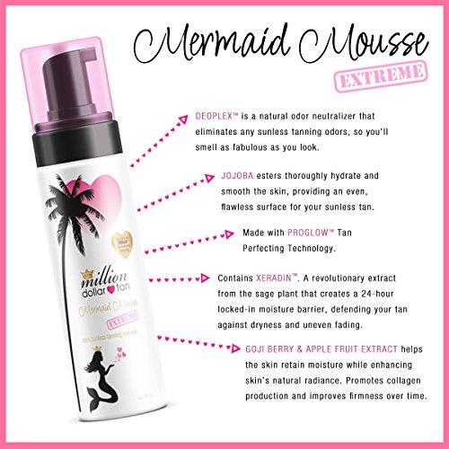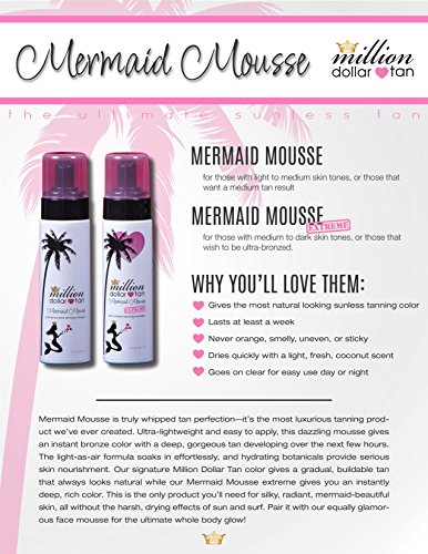 Mermaid Mousse Extreme is a more intense, yet just as fabulous, version of our whipped tanning mousse. Still ultra-light and effortless to apply, it has an extra boost of color for those with darker skin tones or anyone wishing to be ultra-bronzed. Don't let the word "extreme" scare you off-like all of our products, this mousse provides a gradual, build-able color that always looks natural. It's also packed with vitamins and seriously hydrating moisturizers for enviably smooth, soft skin. Use it with our extreme face mousse for the rich all-over color you crave!Feature
