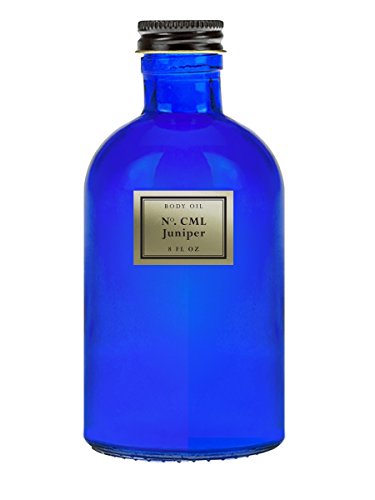 - THE BEST IN NATURAL SKINCARE - Indulgent body oil scented naturally with therapuetic grade juniper essence - Used as a daily moisturizer, a massage oil, or added to a bath - Clear, non-greasy formula doesn’t stain clothing and leaves skin silky and hydrated - Enriched with Vitamins A and E - Collectible vintage style cobalt apothecary bottle, pump top included