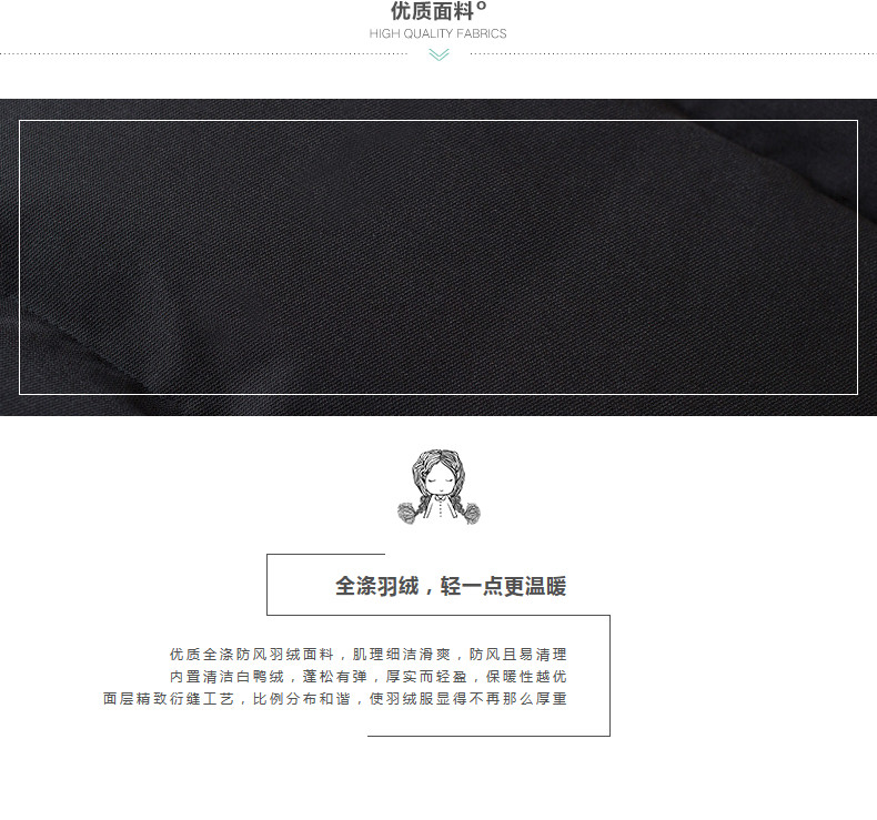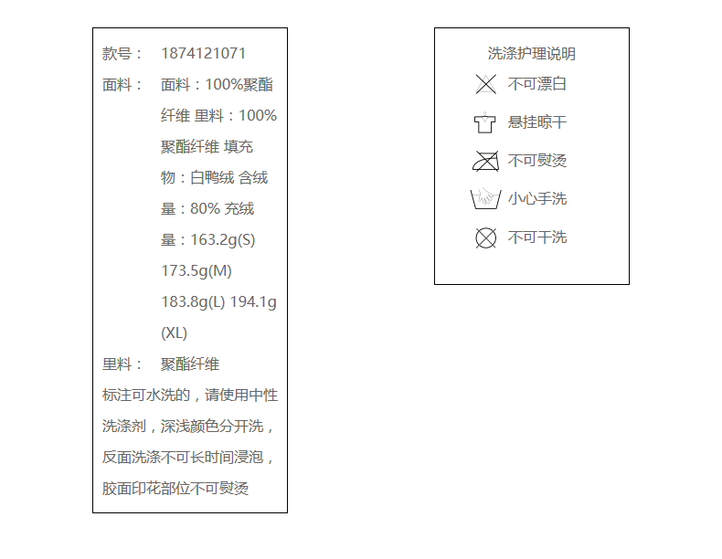 面料:100%聚酯纤维 里料:100%聚酯纤维 填充物:白鸭绒 含绒量:80% 充绒量:163.2g(S) 173.5g(M) 183.8g(L) 194.1g(XL)