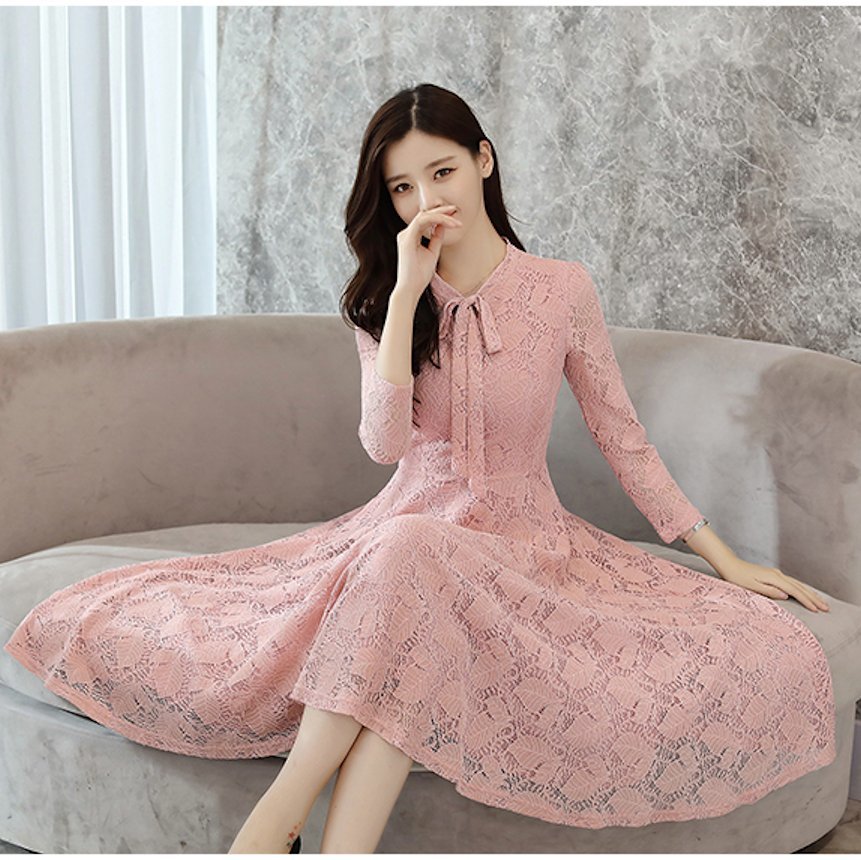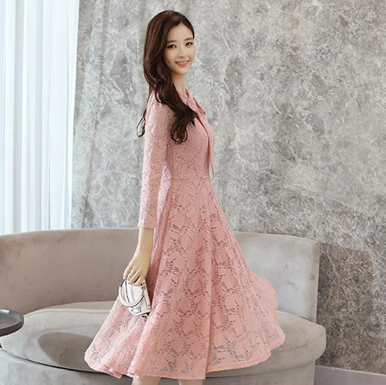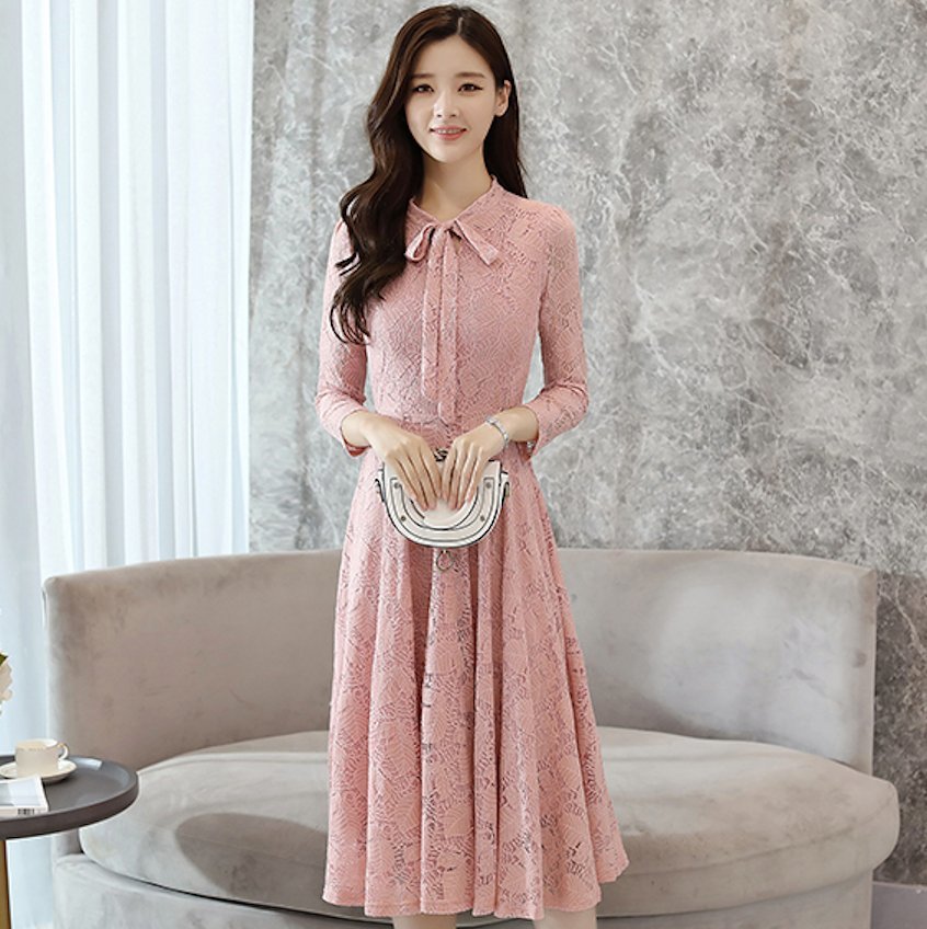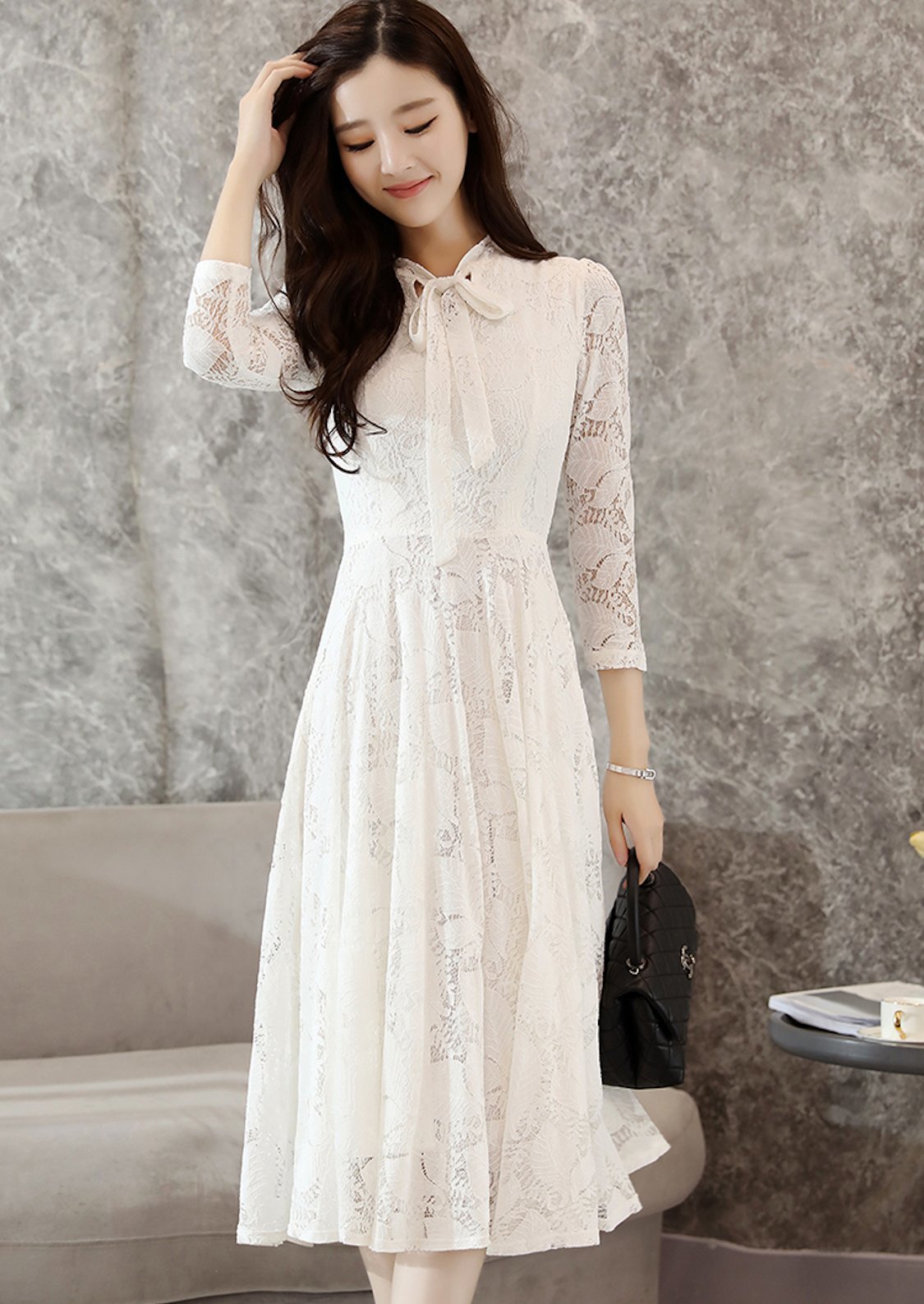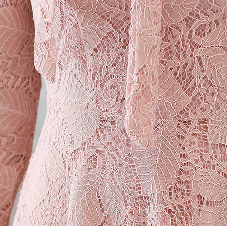 リーフ柄のレース刺繍にネックリボンが大人フェミニンなミモレ丈ワンピースドレス。