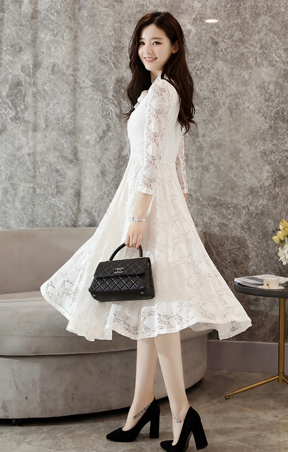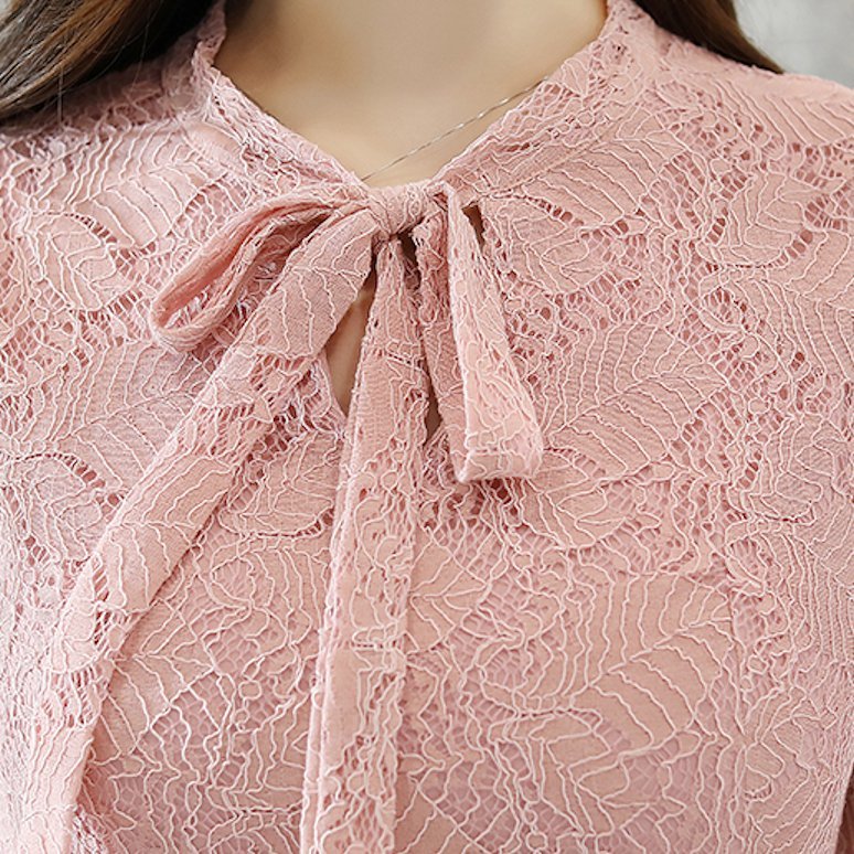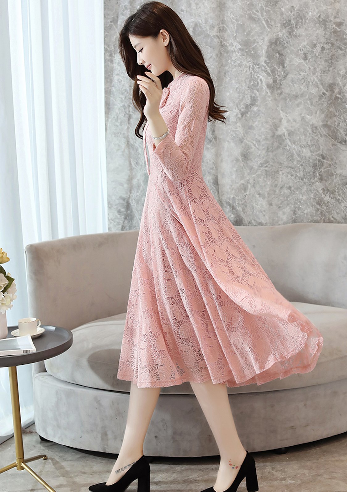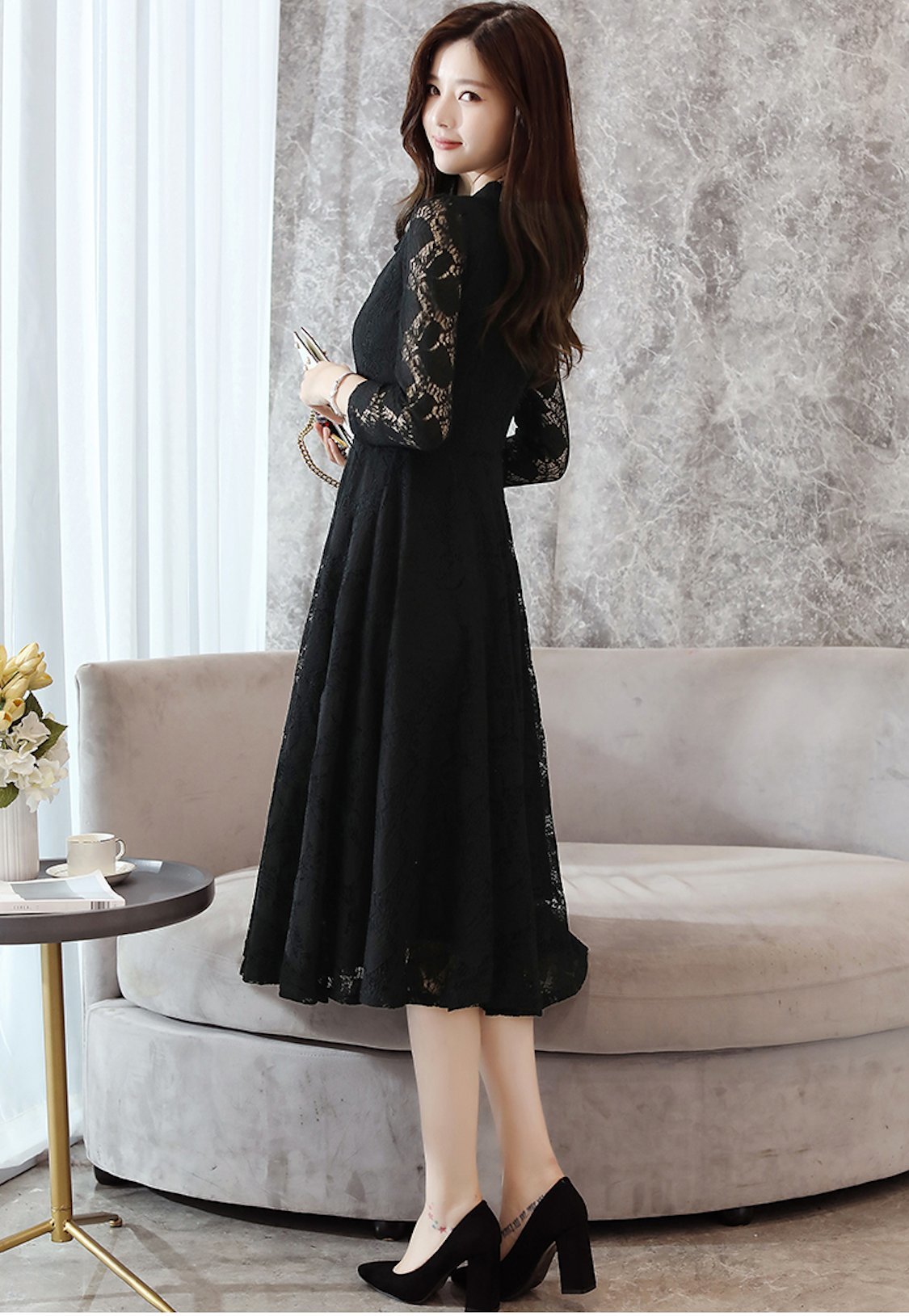 リーフ柄のレース刺繍にネックリボンが大人フェミニンなミモレ丈ワンピースドレス。