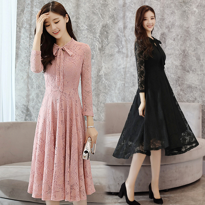 大人フェミニン リーフ柄 レース ミモレ丈 ワンピース ネック リボン 春 お呼ばれ 結婚式 ロング 長袖 刺繍 パーティー 女子会 春
