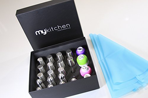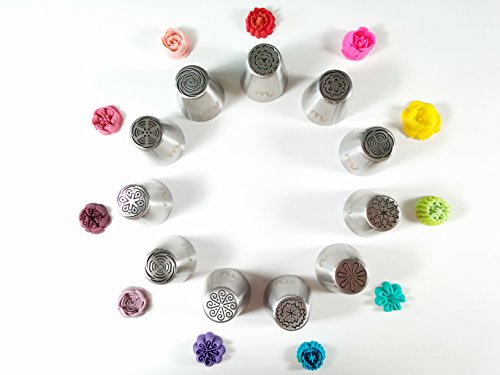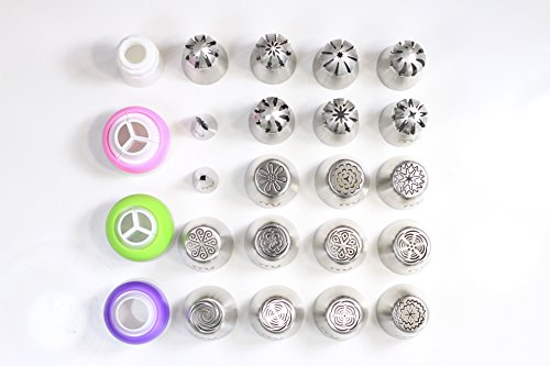 ✿ EVERYTHING YOU NEED to create your perfect desserts. This set includes: ✿ 11 Extra Large Malaysian Flat Tips with a tricolor coupler, ✿ 7 Extra Large Ball Tips with a single color coupler & a tricolor coupler, ✿ 2 Leaf Tips with a single color coupler, ✿ 3 Silicone Piping Bags (12", 14", & 16")