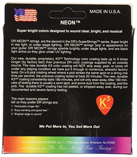 Studio : DR Music Publisher : DR Music Binding : Electronics Product Description DR NEON Multi-Color Strings make learning fast, easy and fun. DR NEON Multi-Color Strings are super bright color-coated strings that sound clear, bright and musical and are an excellent idea for those learning to play or just wanting to add color to their rig. Super bright in daylight and under stage lighting, DR NEON Multi-Color Strings are 100% black light active and glow strongly under UV lighting. These strings will last as long as a coated string should (three to four times as long as uncoated strings) while maintaining tone that is not only good, but better than top-quality uncoated strings. Recommended for use in coordination with mobile platform learning systems such as Jamstar. Visit drstrings.com for more information. 0