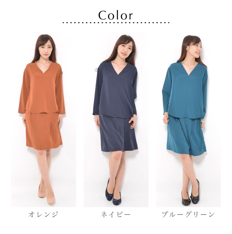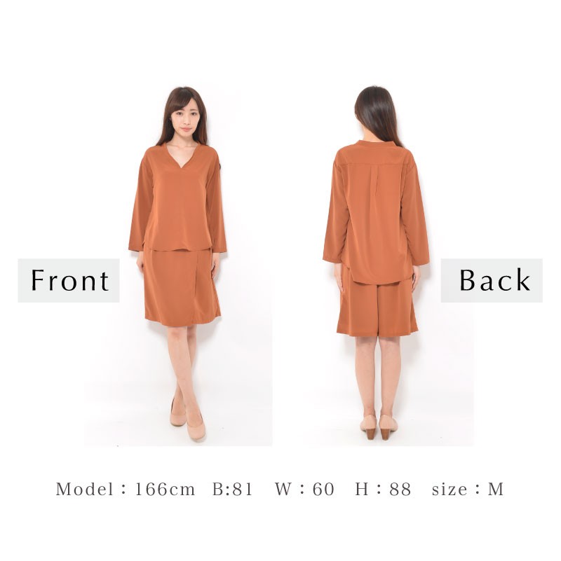 単品ではくのはもちろん、同素材のVネックブラウスとセットアップで着こなせば、きれいめスタイルに◎