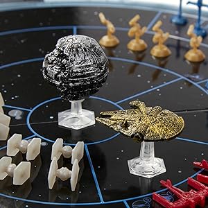 - Includes 3 gameboard pieces, 20 X-wings, 16 Y-wings, 56 TIE fighters, 6 Rebel fleet markers, Millennium Falcon ship with stand, Executor with stand, Death Star with stand, 4 hit tokens, 9 Stormtrooper figures, Rebel Strike Team token, 30 Empire order cards, 30 Rebel order cards, and 5 translucent dice.